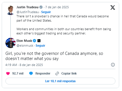 O bilionário Elon Musk se envolveu em uma polêmica entre o presidente eleito dos Estados Unidos, Donald Trump, e o primeiro-ministro canadense, Justin Trudeau, a respeito da anexação do Canadá. Musk questionou a legitimidade de Trudeau para responder a Trump, uma vez que o primeiro-ministro havia anunciado sua saída do cargo. Em tom sarcástico, o CEO da SpaceX afirmou: “Garota, você nem é mais governador do Canadá, então o que você diz não importa”. A declaração de Musk surgiu em resposta a Trudeau, que havia declarado que não havia possibilidade de o Canadá se tornar parte dos Estados Unidos. O título de governador é uma alusão a uma provocação constante de Trump – considerando que o Canadá seria o 51o estado dos Estados Unidos, Trudeau seria apenas um governador americano, não o primeiro-ministro de uma nação autônoma.