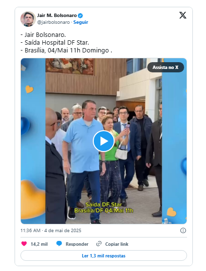 Em uma mensagem nas redes sociais na manhã de domingo, Bolsonaro agradeceu aos médicos e disse que voltava para sua casa “renovado”. Afirmou que seu “próximo desafio” será participar de uma manifestação em Brasília na próxima quarta-feira. O ato busca reunir apoio a um projeto de anistia no Congresso para os condenados pela invasão bolsonarista à sede dos Três Poderes em janeiro de 2023.