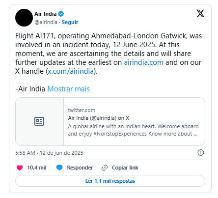O presidente da companhia aérea, Natarajan Chandrasekaran, também escreveu em um comunicado sobre a tragédia. “Nossos pensamentos e profundas condolências estão com as famílias e entes queridos de todos os afetados por este evento devastador”, afirmou. O executivo acrescentou que um centro de emergência foi ativado e uma equipe de apoio foi acionada para atender às famílias que buscam informações.