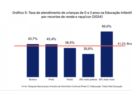 Um novo estudo da organização “Todos Pela Educação” revela um aumento na desigualdade de acesso a creches no Brasil. Atualmente, 2,3 milhões de crianças de até três anos estão fora do ensino infantil, o que corresponde a 41,2% do total nessa faixa etária. O levantamento, divulgado nesta segunda-feira (11) e baseado em dados do IBGE e do Censo Escolar, mostra que o país está longe de atingir a meta do Plano Nacional de Educação (PNE), que previa 50% de atendimento para essa faixa etária até 2024.