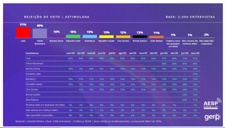 No recorte de rejeição, o levantamento mostra que Lula lidera, com 51% dos entrevistados afirmando que não votariam no petista. Em seguida aparece Flávio Bolsonaro, com 45% de rejeição.