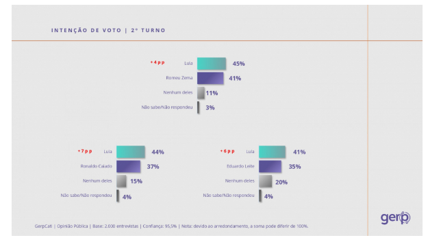 No primeiro cenário, Lula soma 38% das intenções de voto, contra 36% de Flávio. Em seguida aparecem Ciro Gomes (7%), Ratinho Júnior (4%), Romeu Zema (3%), Ronaldo Caiado (3%), Renan Santos (1%) e Aldo Rebelo (0%). Nenhum deles soma 3%, e 6% não souberam ou não responderam.